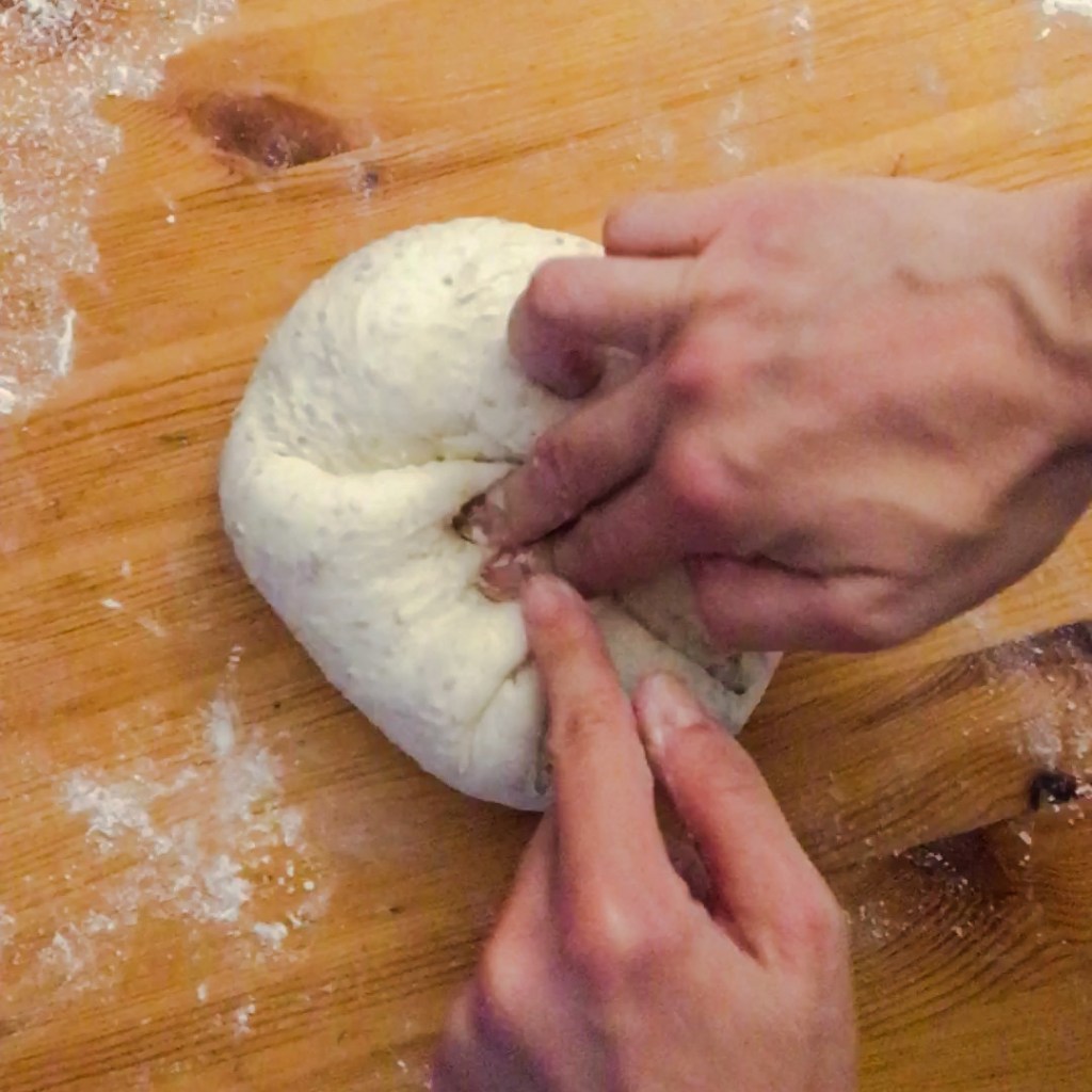 El tercer paso es el formado del pan. Saca la masa de la nevera, dale entre media hora y una hora para que se atempere un poco, depende de la temperatura que haga en casa. Extiende la masa sobre la mesa y aplasta un poquito, añade en este paso las semillas y amasa para que se repartan bien por la masa. Una vez tienes tu bolita de masa con las semillas, ve cogiendo la masa de los extremos y llévala hacia el centro para ir metiendo presión, haz esto varias veces por todo el alrededor de la masa. Dale la vuelta y bolea con las dos manos el bollo. Llévalo a tu banetón para que repose antes del horneado, el mío ha estado una hora y media más o menos.