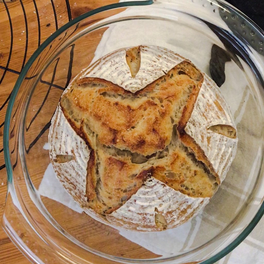 El cuarto y último paso es el horneado. Para los panes redondos yo siempre utilizo una fuente de cristal con tapadera apta para horno. Precalienta el horno arriba y abajo con aire a unos 220º con la bandeja y la fuente dentro. Cuando alcance la temperatura, saca la fuente con cuidado, pon el pan dentro (boca arriba, en su posición natural) hazle cortes a tu gusto, tapa la fuente y métela en el horno. En unos 25-30 minutos lo tendrás cocido y prácticamente con su forma final. Pasado este tiempo, quita la tapadera de la fuente, baja la temperatura a unos 200º, quita el aire y el unos 12-15 minutos lo tienes terminado. Es fundamental que dejes que el pan se enfríe sobre una rejilla antes de cortarlo.