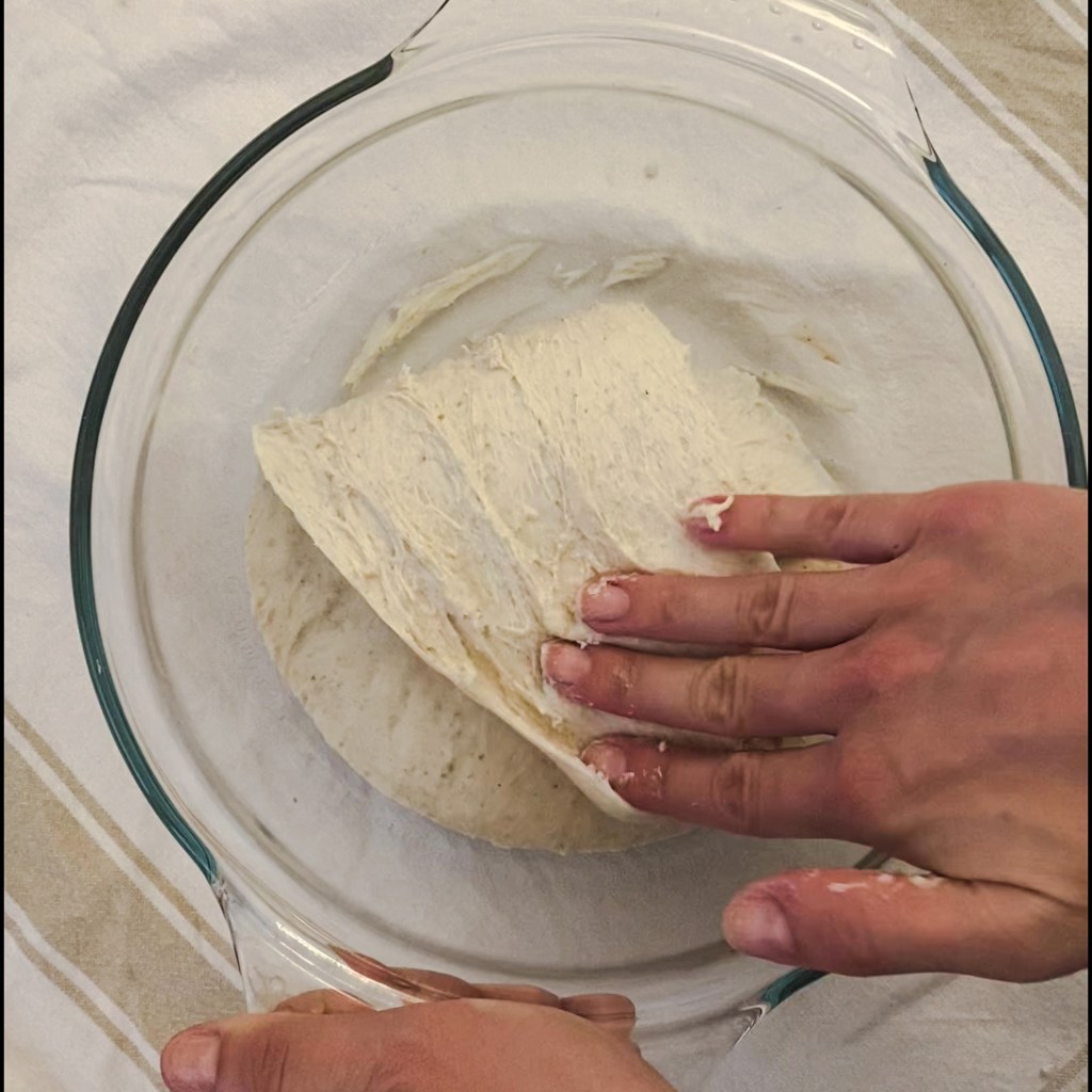 El segundo paso es hacer los pliegues. Consiste en dar un amasado ligero a la masa dentro del propio bol plegando la masa sobre sí misma varias veces. Este proceso se repite un total de 3 veces dejando un reposo de unos 40-50 minutos entre cada pliegue. Tras el tercer y último plegado, deja un reposo de una hora y guarda la masa muy bien tapada en el frigorífico toda la noche (unas 12-14 horas) para que la masa fermente poco a poco en frío.