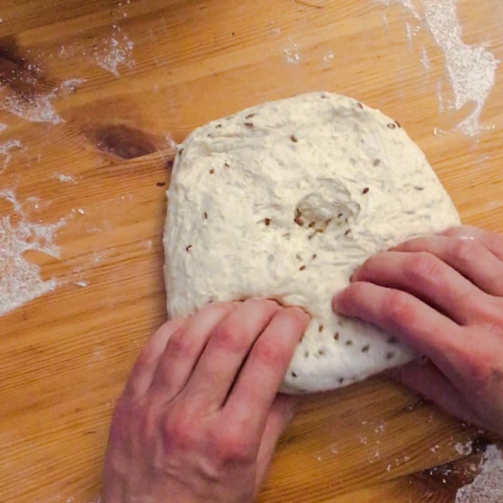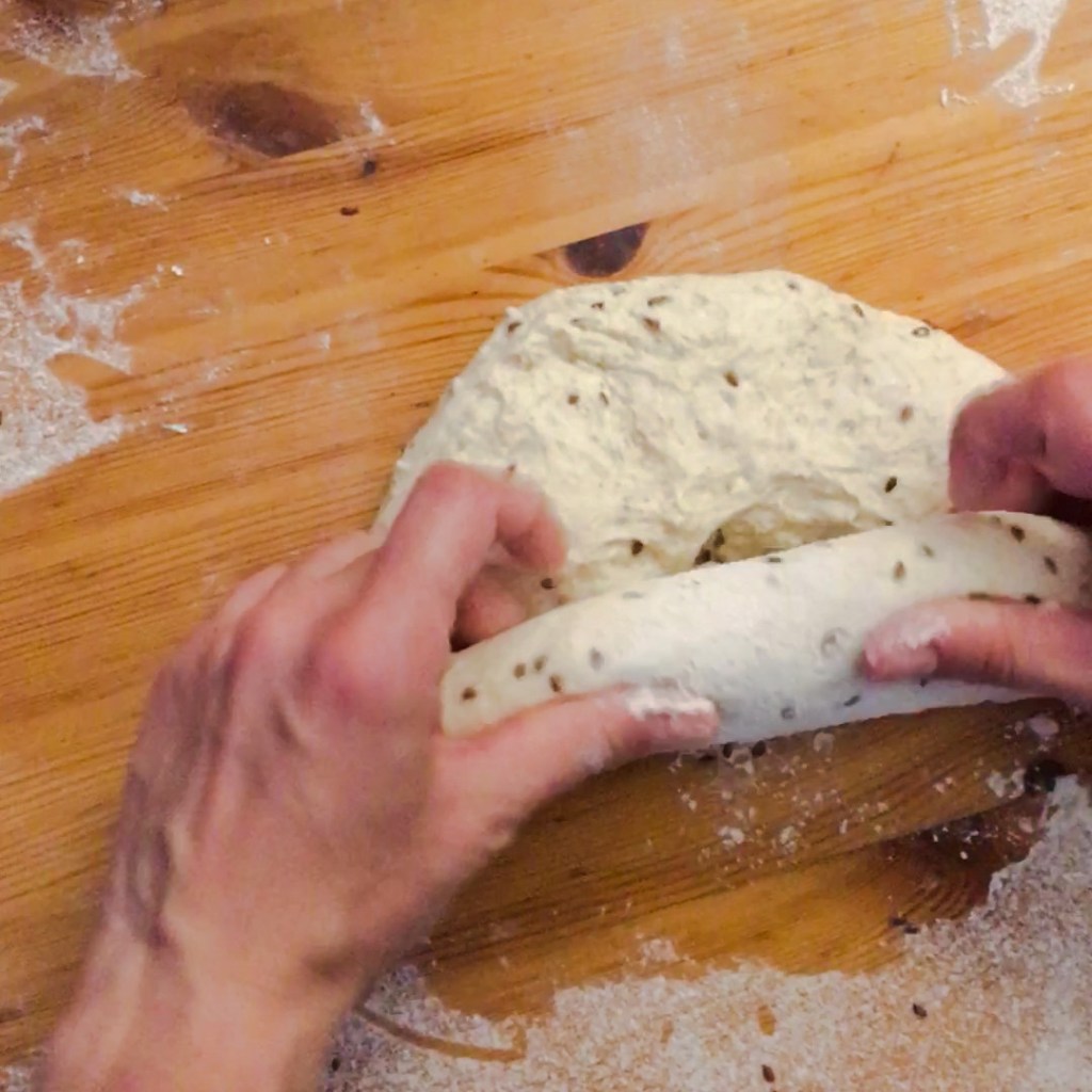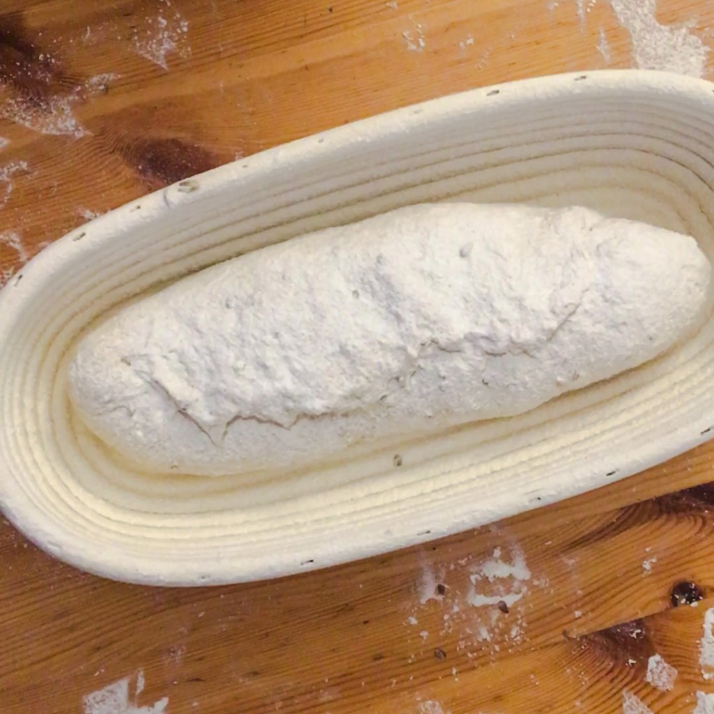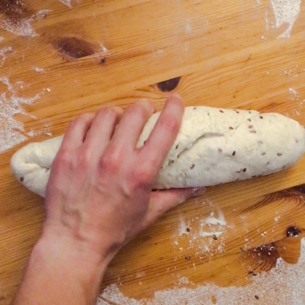 El tercer paso es el formado del pan. Saca la masa de la nevera, dale entre media hora y una hora para que se atempere un poco, depende de la temperatura que haga en casa. Extiende la masa sobre la mesa y aplasta un poquito, añade en este paso las semillas y amasa para que se repartan bien por la masa. Una vez que tengas una bola con todo integrado haz la forma de la barrita (o más bien bollo alagado). Ponlo en tu banetón bien enharinado y déjalo reposar una hora antes de hornear.