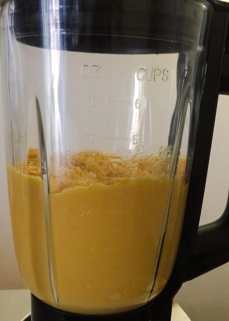 Sigamos con el proceso. La masa de esta tarta debe quedar bastante batida, muy cremosa así que para mezclar los primeros ingredientes debes usar una batidora, puedes usarla de mano o de vaso, yo usé una de vaso. Incorpora la calabaza, los huevos, la leche y el aceite y bate todo hasta que quede integrado y con la textura de una crema de verduras.