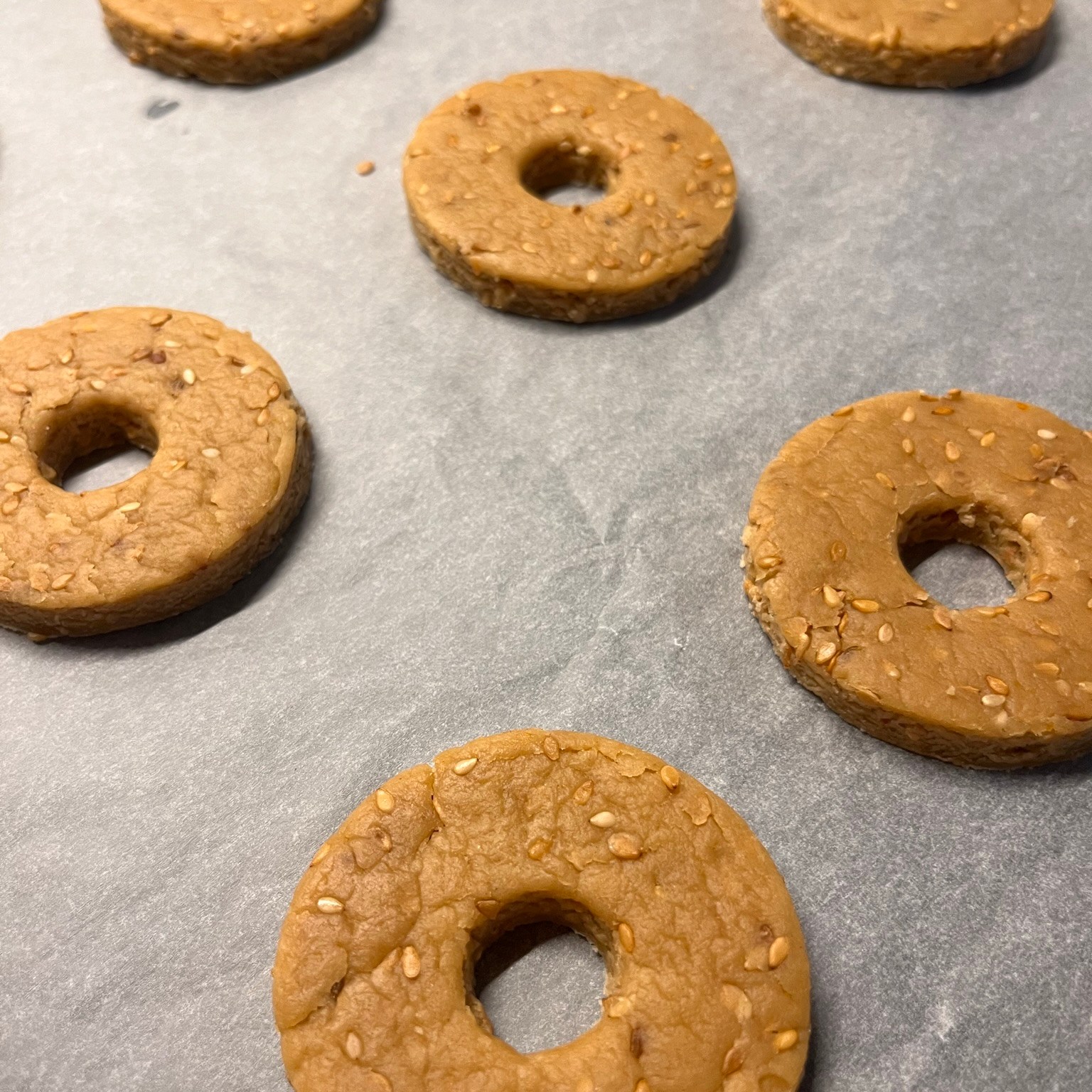 Cuando los tengas cortados, enciende el horno a 180º con calor arriba y abajo, sin aire y mientras se calienta ve colocando los roscos en la bandeja de hornear sobre papel de horno (puedes usar el que has usado para estirar la masa si has terminado).