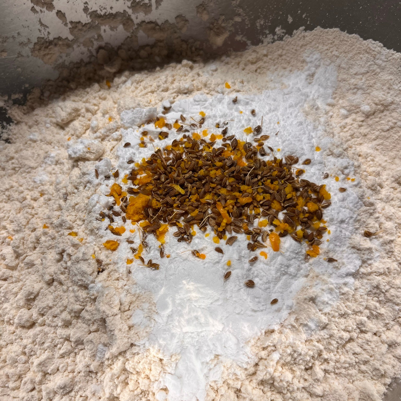 Tostado y enfriado todo, tamiza la harina y añádele el sésamo, el azúcar, el anís y la ralladura de naranja. Mezcla todo para que se vaya integrando.