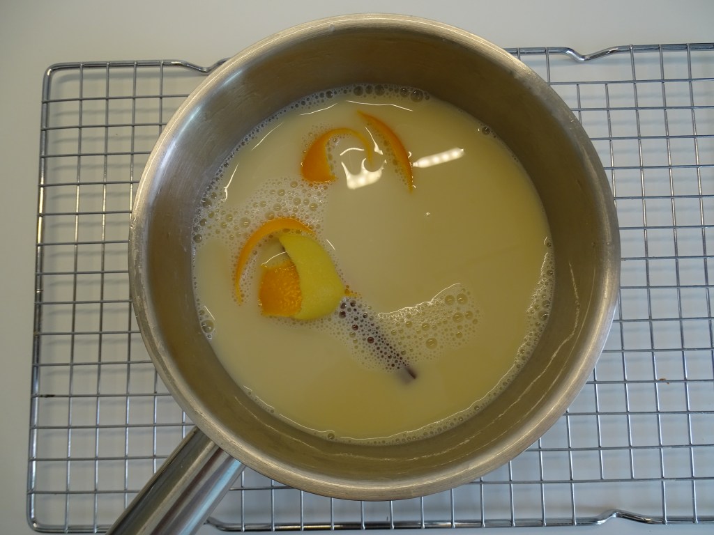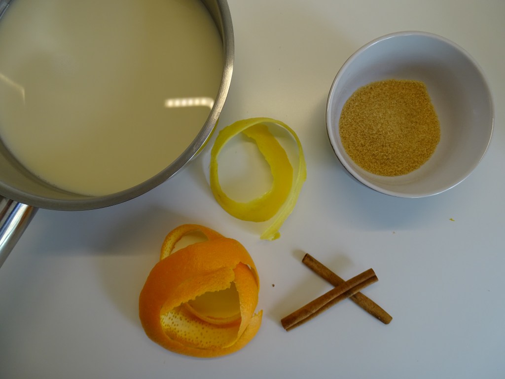 - El primer paso es poner en un cazo la bebida vegetal, con las ralladuras, las ramas de canela y el azúcar moreno. Calienta todo a fuego medio hasta que hierva un par de minutos. Apaga y deja que se enfríe, o al menos que no te quemes al meter los dedos.
