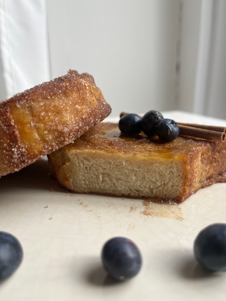 - Ya tienes las torrijas y ahora solo te queda el emplatado. Esto puedes hacerlo como más te guste. Yo les puse un poquito de miel y unos arándanos y me quedaron espectaculares.