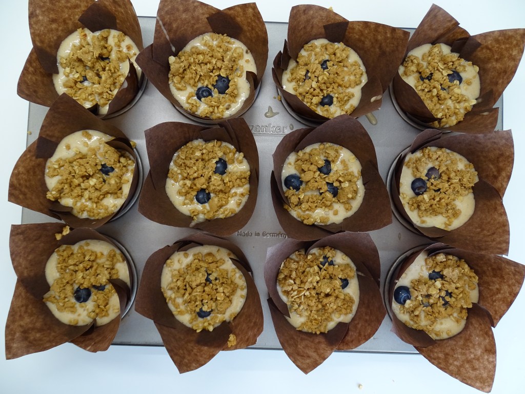 - Distribuye la masa en las cápsulas y reparte por encima los arándanos de decoración y el crumble que con el frío habrá cogido una textura más manejable.